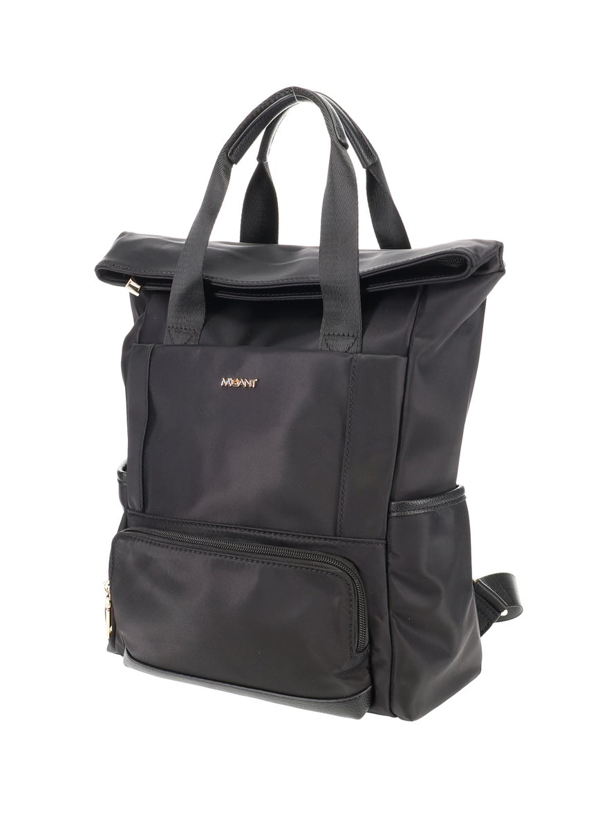 Migantin musta reppu. Reppu on tekstiiliä ja siinä on osioita keinonahasta.Repun sisällä on vetoketjutasku ja kaksi avotaskua. Ulkopuolella edessä on vetoketjutasku sekä nepparilla suljettava tasku.Takana on vetoketjutasku. Reppuun mahtuu 15,6" tietokone,